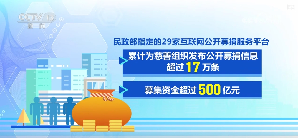目前,全国共登记认定慈善组织超过1.5万家,是五年前的三倍;全国累计备案慈善信托2062单,是五年前的十五倍。年度捐赠总额最高突破2000亿元,民政部指定的29家互联网公开募捐服务平台累计为慈善组织发布公开募捐信息超过17万条,募集资金超过500亿元。