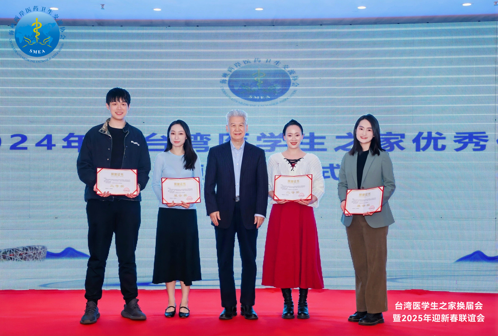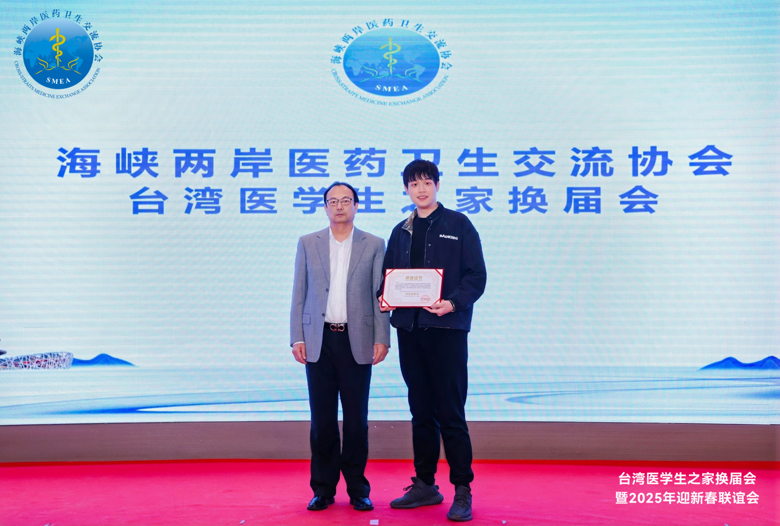 为了表彰第一届台湾医学生之家表现突出的个人,大会特设颁奖环节。高子淮、刘元媛同学因在筹建台湾医学生之家及组织各类活动中的卓越贡献而荣获特别贡献奖证书,他们的事迹激励着在场每一位学子继续努力,为两岸医学青年人文交流贡献力量。