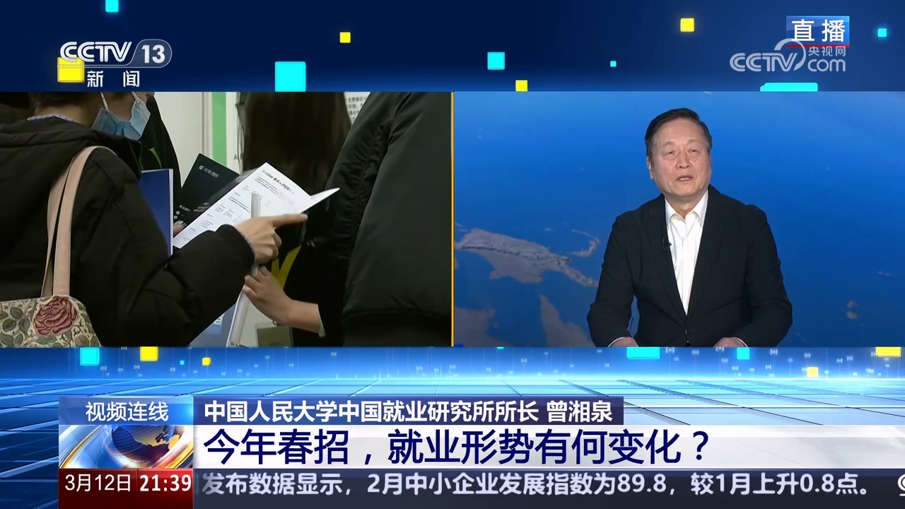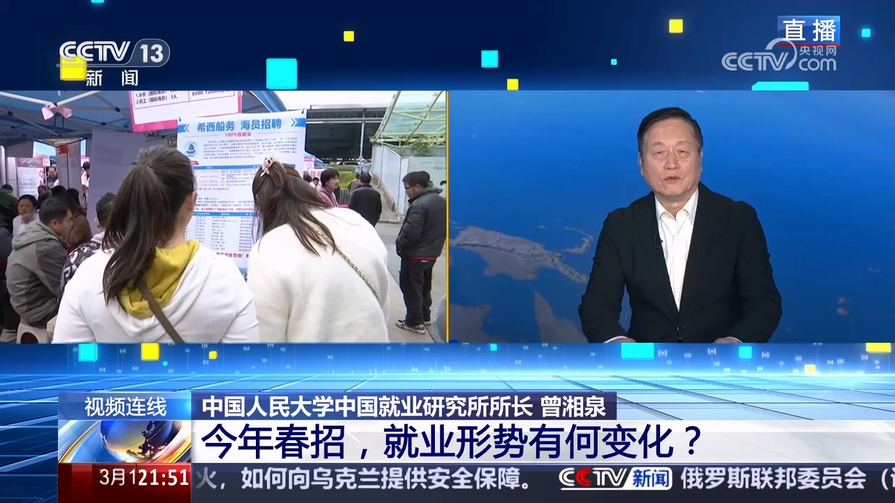 央视网消息:眼下,“金三银四”的春季招聘,正在各地进行。今年的春招有什么新变化?新兴行业和传统行业,哪些需求在上升?面对今年的就业目标,各个经济大省在稳岗扩岗方面,又在采取哪些措施?《新闻1+1》连线中国人民大学中国就业研究所所长曾湘泉,为你解读。