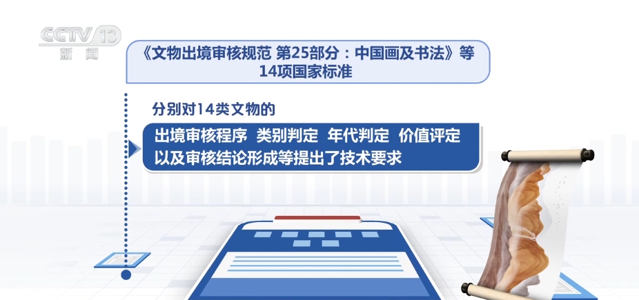 《文物出境审核规范 第25部分:中国画及书法》等14项国家标准,分别对14类文物的出境审核程序、类别判定、年代判定、价值评定以及审核结论形成等提出了技术要求。