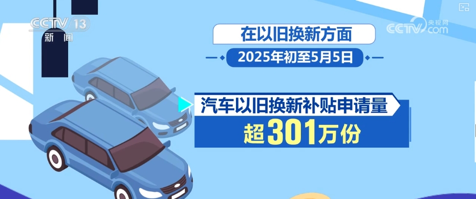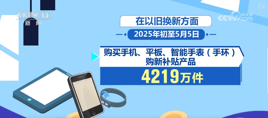 在以旧换新方面,2025年初至5月5日,汽车以旧换新补贴申请量超301万份;消费者购买12大类家电以旧换新产品5602万台,购买手机、平板、智能手表(手环)购新补贴产品4219万件,电动自行车售旧、购新均超500万辆。