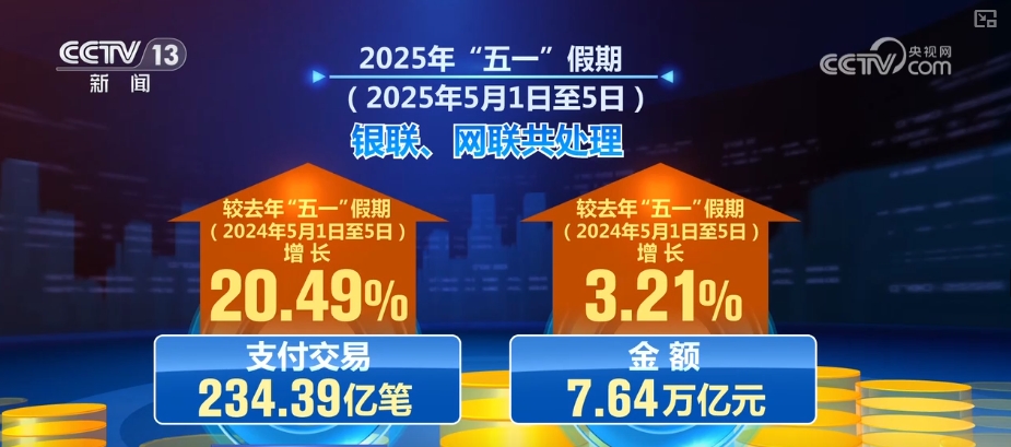 中国人民银行5月6日发布的数据显示,2025年“五一”假期,银联、网联共处理支付交易234.39亿笔、金额7.64万亿元,较2024年“五一”假期分别增长20.49%和3.21%。