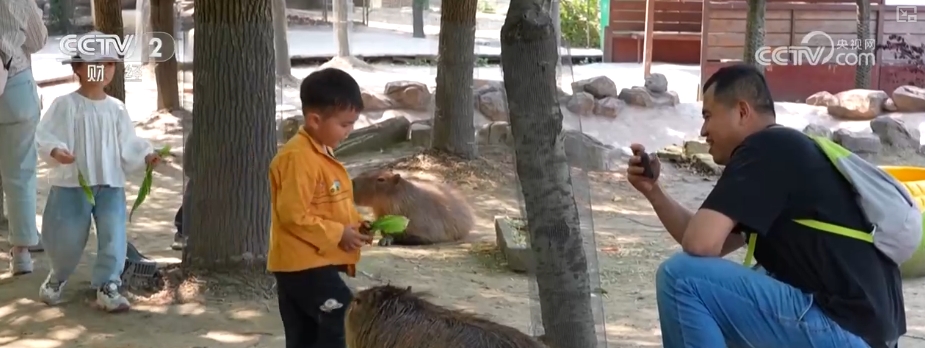 在这家动物园的孔雀园区,正上演这个季节的“限定美景”。几只蓝孔雀“集体开屏”,引得游客纷纷拿出手机拍照、合影。而在水豚园里,情绪稳定、一动不动的水豚,吸引了不少小朋友近距离互动投喂。