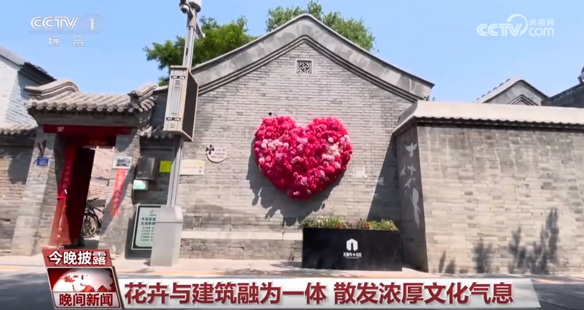 在西城区的烂漫胡同,错落有致的花卉绿植与北京胡同建筑融为一体。无论是绕墙而上的深红色月季装饰,还是粉色月季组成的“心”形装置,虽然也运用了一些假花,但别出心裁的设计,让巷陌宫墙间流淌着花香与时光交织的诗意,随手一拍都很出彩。