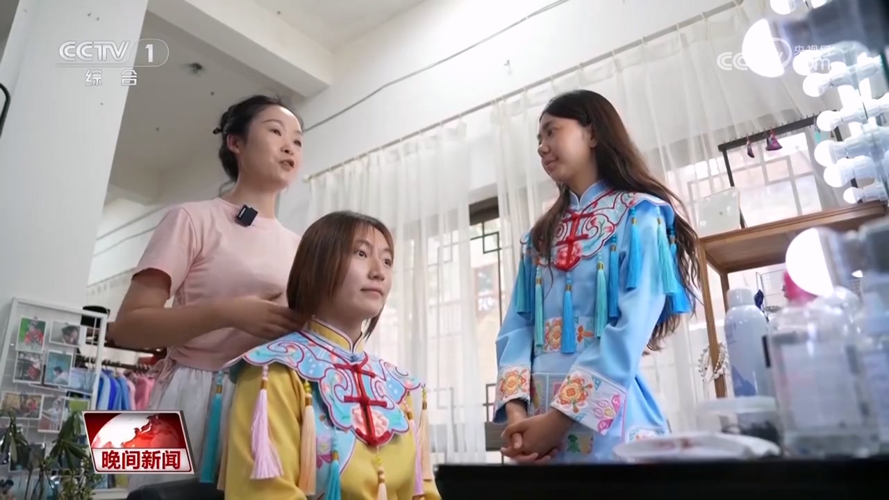 游客如约而至,陈昌敏随即带着她们挑选服装,考虑到是年轻闺蜜组团拍摄,她推荐改良款羌服——既保留传统纹样又显腰身,同时羌服颜色相呼应,不仅有松弛感还能突出个人特色。