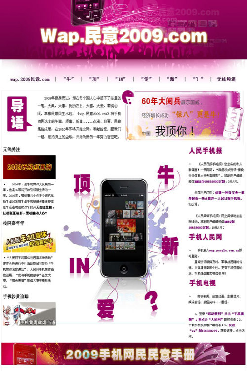 《wap.民意2009.com》手册集丰富的内容、真诚的草根民意、时尚的版面于一身,以2009年网络流行语“牛”、“顶”、“IN”等为关键词,将“国庆阅兵”、“全民携手防控甲流”、“大学生英勇救人”等热点事件“一网打尽”。并将手机网友对此类事件的民意集结成册,是第一份属于亿万手机网民的独家刊物,也是手机网友回顾2009,展望2010的又一盛宴。