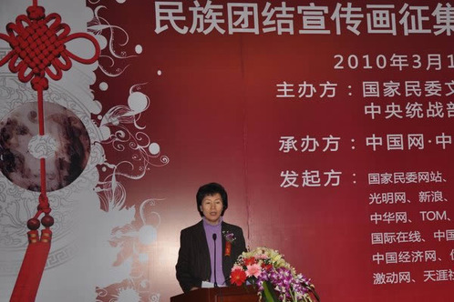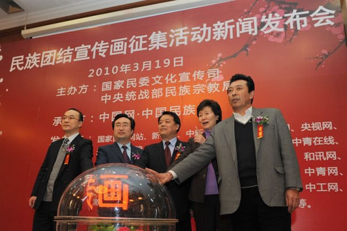为贯彻落实中共中央办公厅、国务院办公厅《关于深入开展民族团结宣传教育活动的意见》精神,向社会提供主题鲜明、健康向上、反映时代风貌、准确权威的民族团结宣传品,展示我国各民族共同团结奋斗、共同繁荣发展的时代风貌,由国家民委文化宣传司、中央统战部民族宗教局主办,中宣部宣教局支持,中国网中国民族频道承办,国家民委网站、中国民族宗教网、人民网、中新网、中国网,光明网、中国文明网、中华网、TOM、中国经济网、国际在线、中青在线、中青网,央视网、中国广播网、凤凰网、中国经济新闻网、网易、新浪网、腾讯、搜狐、千龙网、优酷网、酷六网、猫扑网,激动网、中工网、天涯社区、环球网、中国日报网、和讯网,中国企业新闻网,北青网等共同发起宣传的民族团结宣传画征集活动新闻发布会于2010年3月19日下午在北京国家民族事务委员会举行,国家民委副主任丹珠昂奔及国家民委、中央宣传部、中央统战部有关部门的同志出席了新闻发布会。
