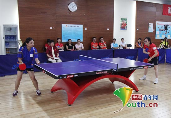 中国台湾网和新浪网在第二场女单比赛中。其中身着蓝色衣服的是新浪网队员,身着红色衣服的为中国台湾网队员。中国青年网记者 李铁摄