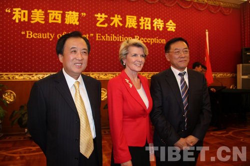 中国西藏网堪培拉5月29日报道(马恺 王梦璐)由中国侨联、中国西藏网和上海侨联联合举办,澳洲中国和平统一促进会、上海市华侨基金会承办的“2013·和美西藏美术摄影作品澳大利亚展”5月29日晚在堪培拉中国驻澳大利亚大使馆拉开帷幕。这是中国首次在澳大利亚举办西藏主题的美术摄影作品联展。“和美西藏”代表团团长、中国侨联主席林军和中国驻澳大利亚大使陈育明,澳大利亚联邦反对党副领袖毕晓普在开幕式上致辞。澳大利亚政要、议员和商界、文化界、学术界名流、媒体人士以及一些国家驻澳使节近200人出席开幕式。