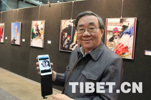 澳籍华人黄亭荣用手机拍摄了“和美西藏”艺术展作品中他喜欢的一副作品。 摄影:闫洁