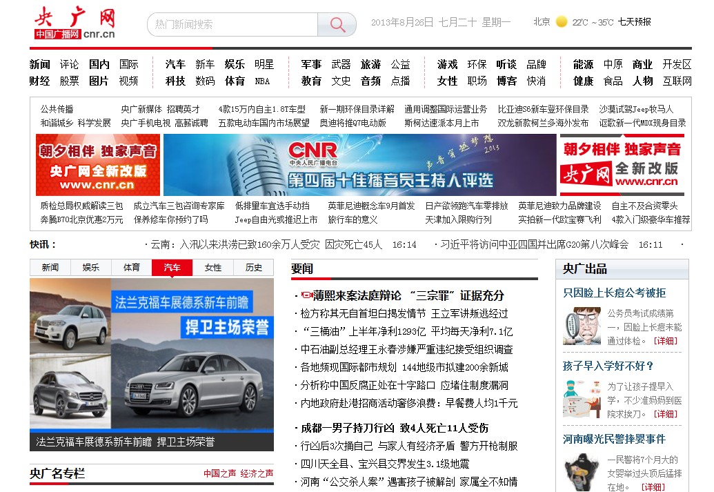 中国广播网(以下简称央广网)依托中央人民广播电台中国之声、经济之声等16套广播频率、中国广播联盟200余家成员台的深厚新闻资源,继续扩大原创和快新闻的优势,持续发力央广网旗下的中国广播集成平台、有声阅读、互联网电视等新媒体业务,不断拓展PC端、手机端、电视端业务的领先格局。