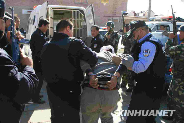 10月20日上午8时13分许,经过万余名公安民警和武警官兵66小时的大搜捕,内蒙古4名袭警越狱逃犯在呼和浩特市和林格尔县台几村附近被发现,公安民警当场击毙1名拒捕逃犯,其他3名逃犯相继落网。一名民警在抓捕过程中受伤。图为警察将一名越狱者押上警车。 新华社发