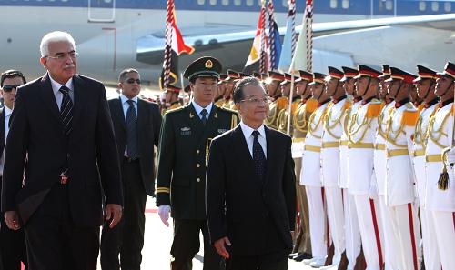 埃及总理纳齐夫在舷梯旁迎接温家宝。机场上举行了隆重的欢迎仪式。埃及军乐队奏中埃两国国歌。温家宝在纳齐夫陪同下检阅仪仗队。中国驻埃及大使武春华及使馆工作人员、华侨华人代表等也到机场欢迎。温家宝的主要陪同人员同机抵达。