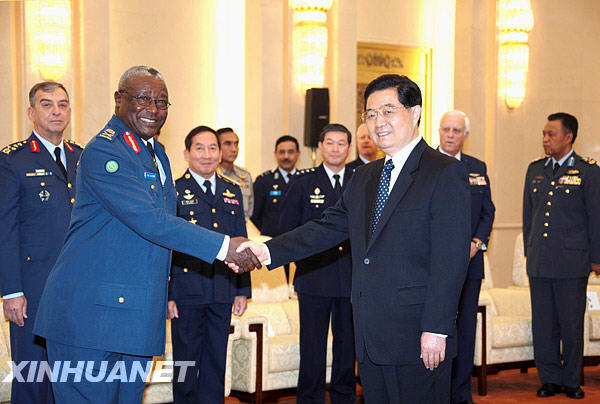 11月6日,国家主席、中央军委主席胡锦涛在北京人民大会堂会见应邀前来参加中国人民解放军空军成立60周年“和平与发展国际论坛”的巴基斯坦等30国空军代表团团长。新华社记者王建民摄