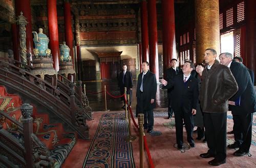 奥巴马沿着位于旧北京城中轴线上的御道,先后参观了旧时王朝政治生活中枢的太和殿、中和殿、保和殿,和以处理日常政务和居住游玩为主要功能的“内廷”乾清宫、交泰殿、坤宁宫。故宫博物院院长郑欣淼陪同讲解。
