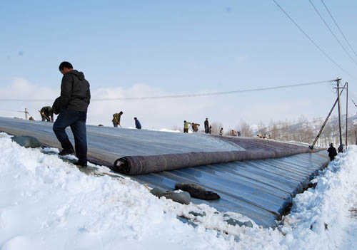 11月12日,群众组织起来支起被暴雪压倒的蔬菜大棚。