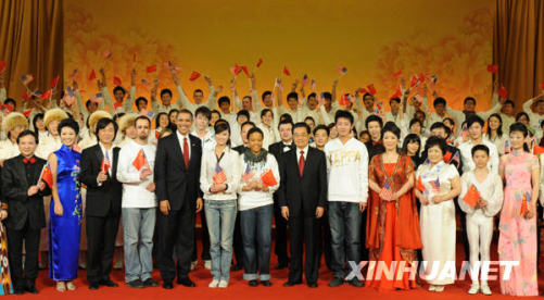 11月17日晚,国家主席胡锦涛在北京人民大会堂举行宴会,欢迎来华访问的美国总统奥巴马。这是胡锦涛和奥巴马同在宴会上表演精彩文艺节目的艺术家和中美大学生一起合影。新华社记者黄敬文摄