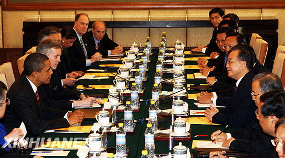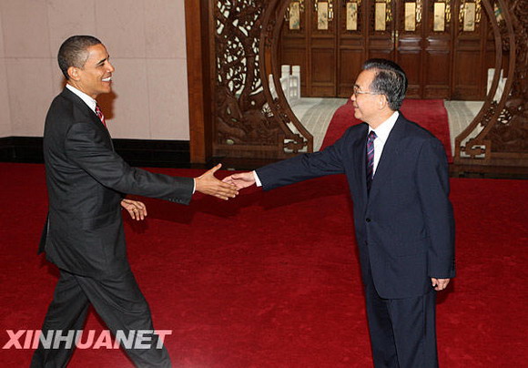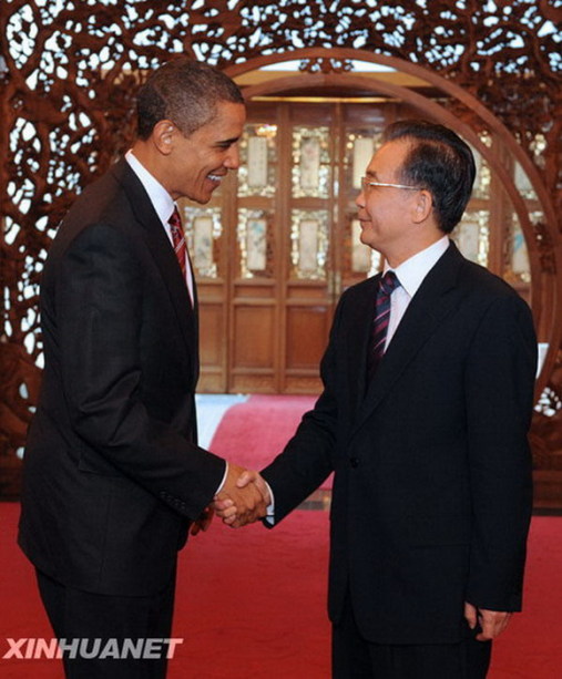 11月18日,中国国务院总理温家宝在北京钓鱼台国宾馆会见正在中国进行国事访问的美国总统奥巴马。