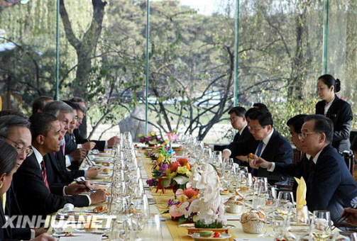 11月18日,中国国务院总理温家宝在北京钓鱼台国宾馆会见正在中国进行国事访问的美国总统奥巴马,并为他举行工作午宴。新华社记者 姚大伟 摄