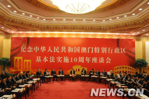 新华网北京12月4日电 中共中央政治局常委、全国人大常委会委员长吴邦国4日在纪念澳门特别行政区基本法实施10周年座谈会上发表重要讲话时指出,澳门特别行政区基本法把“一国两制”伟大构想和国家对澳门的一系列方针政策用法律的形式固定下来,为澳门的顺利回归、平稳过渡和长期繁荣稳定提供了坚实的法律保障。