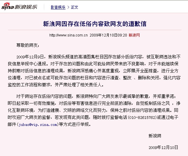 2009年12月9日,新浪娱乐频道的高清图集栏目因存在部分低俗内容,被互联网违法和不良信息举报中心通报。对于存在的问题和由此可能给网民带来的不良影响,对于未能继续保持前期对低俗信息的清理成果,新浪网深感痛心并高度重视,立即展开全面排查,进行全方位清理,对已被点名或可能存在问题的栏目和内容进行清查、整改 、删除和关闭,强化内容监控的工作流程和要求,并严肃处理了相关责任人。