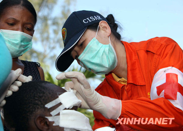 1月17日,一名中国国际救援队医疗队员在海地太子港为地震受伤人员换药。当日,中国国际救援队队员继续在太子港进行医疗服务,他们深入灾民集中居住区为受伤人员诊治换药和进行卫生防疫工作。新华社记者 袁满 摄