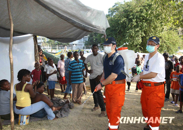 1月17日,中国国际救援队医疗队员在海地太子港临时居住区内喷洒消毒剂。新华社记者 袁满 摄