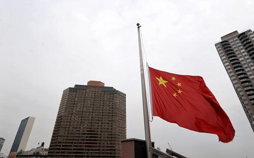 1月19日,在美国纽约中国常驻联合国代表团驻地,为悼念在海地地震遇难的八位中国维和警察,中国常驻联合国代表团下半旗志哀。新华社记者申宏摄