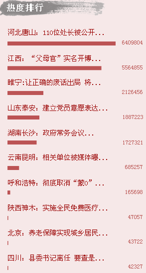前十名依次为,河北唐山:110位处长被公开“晒权”接受社会监督;江西:“父母官”实名开博 网络问政改变官民关系;江苏睢宁:让正确的废话出局 “晒”年度“最差领导讲话”;山东泰安:建立党员意愿表达制 公推直选党员说了算;湖南长沙:政府常务会议“全媒体”直播;云南昆明:相关单位被媒体曝光十日不反馈要问责;内蒙古呼和浩特:彻底取消“蒙0”特权车牌号;陕西神木:实施全民免费医疗 每年报销上限为30万元;北京:城乡统一的居民养老保险制度正式实施 养老保障城乡全覆盖;四川:规定县委书记离任 要查是否违规用人。