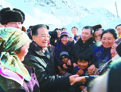 1月23日,温家宝在雪灾严重的阿勒泰市郊区的拉斯特乡散德克村察看灾情,看望哈萨克族牧民群众。新华社记者 李学仁摄