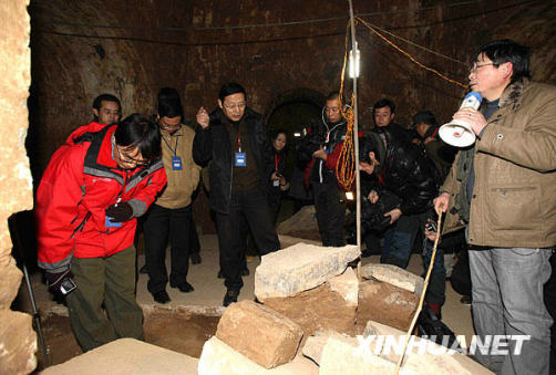 1月11日,专家考察团在考察墓内情况。当日,中国社科院考古研究所专家考察团先秦、汉魏专家、体质人类学专家、古代铭刻专家和东汉、魏晋都城研究专家等12人在安阳考察西高穴墓,考察内容包括墓葬年代、墓葬型制、出土遗物和与墓主人身份相关的器物,这座墓就是引发争议的“曹操墓”。新华社记者 汪永基摄