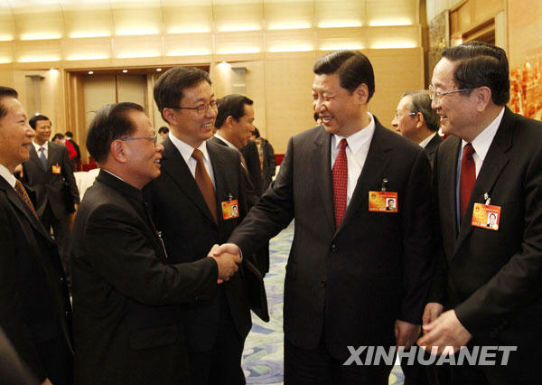 3月5日,中共中央政治局常委、国家副主席习近平来到他所在的十一届全国人大三次会议上海代表团,同代表们一起审议政府工作报告。新华社记者刘建生摄