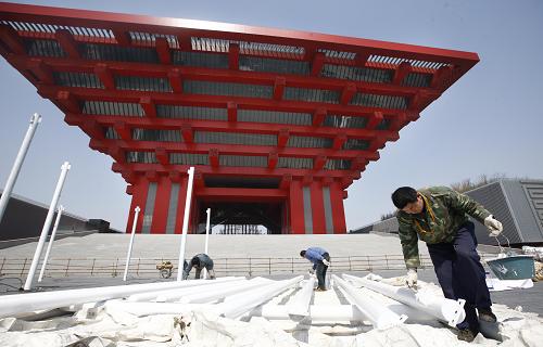 3月11日,工人在中国馆外施工。新华社记者 裴鑫 摄