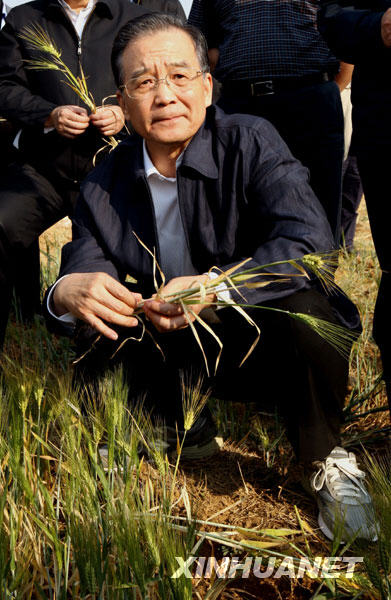 这是3月19日,温家宝来到陆良县芳华镇狮子口村万亩大麦示范田,实地察看农作物受灾情况。 新华社记者 姚大伟 摄
