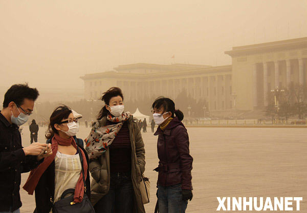 3月22日,几位游客在北京天安门广场游览。当日上午,沙尘再袭北京。中央气象台于6时发布沙尘暴蓝色预警。新华社发(桑全利摄)