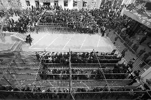 等待签约的居民站在隔离护栏内。昨日,通州运河核心区及西海子棚户区拆迁签约正式启动。记者 周晓东 摄