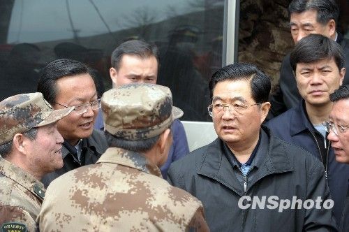 4月18日,中共中央总书记、国家主席、中央军委主席胡锦涛飞抵玉树,看望慰问地震灾区干部群众,实地指导抗震救灾工作。 中新社发 盛佳鹏 摄