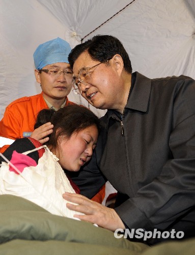 在一个医疗救治帐篷中,胡锦涛握住一位藏族受伤男子的手说,医生们会给你提供精心的治疗,你放心好了。你刚才也讲了,房子没有了,将来的生活怎么办?中央和政府会帮助把房子盖起来的,也会帮助重建家园。