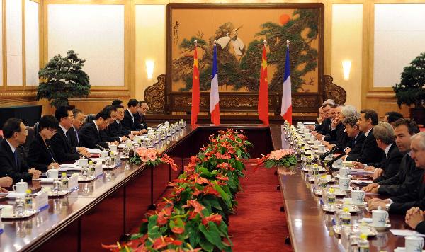 胡锦涛表示,中法都奉行独立自主的外交政策,在推动世界多极化和国际关系民主化方面有着共同语言和共同利益。中方希望同法方一道努力,从以下4个方面推动中法全面战略伙伴关系迈上新台阶:(一)保持高层交往和对话磋商。两国领导人可以通过多种方式保持密切联系。双方要充分发挥战略对话机制作用,就彼此关切的重大问题及时沟通。(二)积极推进务实合作。双方应该加强在转变经济发展方式方面的交流,在搞好传统领域合作的同时,积极推进节能环保、新能源、农业和农产品加工、中小企业等领域合作,抓紧研究新的合作方式,实现长期稳定互利的共同发展。(三)着力丰富人文交流。双方应继续互办文化活动,扩大互派留学生规模,加强对方语言教学,鼓励双向旅游和地方交往,支持双方媒体、智库对话,巩固中法友好社会基础。(四)共同应对各种全球性和地区性挑战。就国际金融体系改革、完善全球经济治理结构、应对气候变化等全球性问题及一些地区热点问题密切磋商,加强政策协调,坚持通过政治和外交手段解决争端,共同营造和平稳定的国际环境。中方高度评价欧盟在国际事务中发挥的重要作用,赞赏法方在促进中欧关系发展方面秉持的建设性立场。