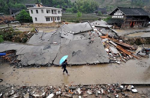 5月7日,在新化县奉家镇,一村民走过被洪水冲毁的房屋。5月6日凌晨至7日上午,湖南省气象台连续发出11个暴雨橙色预警信号,6个暴雨红色预警信号。目前,湖南省有300余个乡镇遭遇强降雨。灾情最严重的新化县,已有5人死亡2人失踪,38万余人受灾。当地多数学校已暂时停课,5300名学生回家避险。新华社记者 赵众志 摄