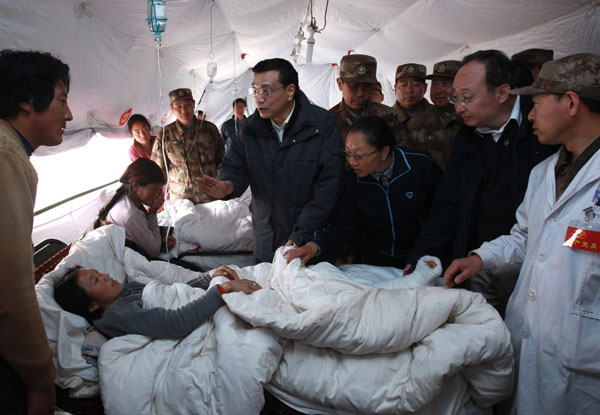 玉树的医疗设施遭到地震摧毁后,玉树县人民医院和解放军某部野战方舱医院在第一时间联手行动,救死扶伤,为灾区群众托起了“生命方舟”。李克强一直关心着灾区的伤员救治和卫生防疫等情况,多次作出重要指示。