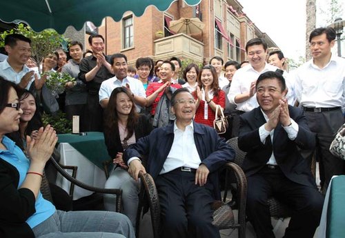 5月13日至14日,中共中央政治局常委、国务院总理温家宝在天津调研。这是5月14日,温家宝来到海河意式风情区,与在这里休闲的游客亲切交谈。新华社记者 刘卫兵 摄(新华网)