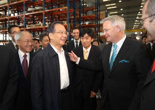5月13日至14日,中共中央政治局常委、国务院总理温家宝在天津调研。这是5月14日,温家宝在西门子电气传动有限公司考察时与外方负责人交谈。 新华社记者 刘卫兵 摄