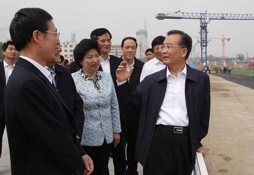 5月13日至14日,中共中央政治局常委、国务院总理温家宝在天津调研。这是5月14日,温家宝来到正在建设中的天津西站综合交通枢纽工程工地,了解工程建设情况。 新华社记者 刘卫兵 摄