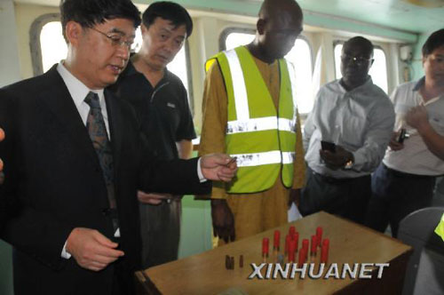 5月18日,在停靠于尼日利亚拉各斯阿帕帕港的“安泽江”号货轮上,中国驻拉各斯总领馆总领事郭崑查看海盗留下的弹壳。记者曹凯摄