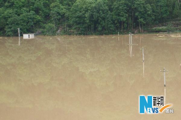 5月18日,贵州省德江县稳坪镇海溪沟,大水快要将电线杆淹没。新华社发