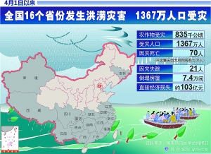 据国家防汛抗旱总指挥部最新统计,4月1日以来,全国累计有16个省份遭受洪涝灾害,农作物受灾835千公顷,受灾人口1367万人,因灾死亡70人(不含重庆因大风倒房死亡32人),失踪21人,倒塌房屋7.4万间,直接经济损失约103亿元。