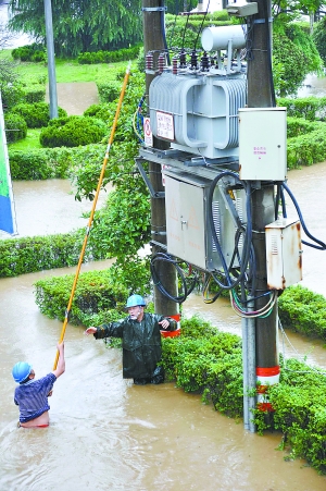 5月18日,婺源县两名电力工人在洪水中紧急断开线路,保护电力设施。5月17日至18日,江西省婺源县普降大到暴雨,全县普遍受灾。截至18日17时,婺源县已转移群众9300余人。新华社发