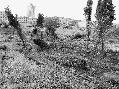 环绕四周,发现被圈起来的地块有100多亩。记者看了看墙外的广告,是万象城的商住开发内容,墙外上午刚刚搞过庆典的广告标语和充气类的宣传工具,矗立在星江路上,与墙内的毁麦现场形成强烈反差,一边是庆典预售,一边是毁麦情况,让人觉得格外显眼。记者顺着田埂前行,放眼南望,偌大的地块除了被毁的麦苗和油菜以外,还有一些松柏类的树木东倒西歪地站立着。最南边是高大的土堆,还有一些建筑类的材料及架板等物件放置在被毁的麦田里。