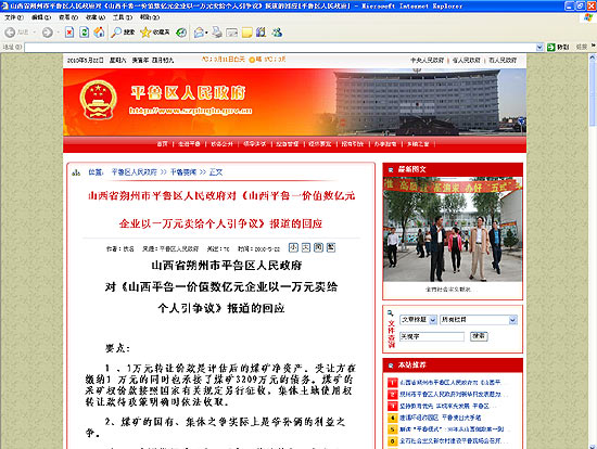 截图:山西省朔州市平鲁区人民政府对《山西平鲁一价值数亿元企业以一万元卖给个人引争议》报道作出回应。